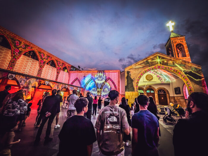 A unique feature of this year’s event was the integration of the textile artwork, designed to complement and soften the new metal awning above the main courtyard. The illuminated textile design acted as both a visual and symbolic centrepiece, with motifs drawn from community themes of peace, the life of St Charbel, and shared light.
